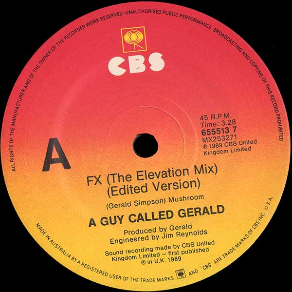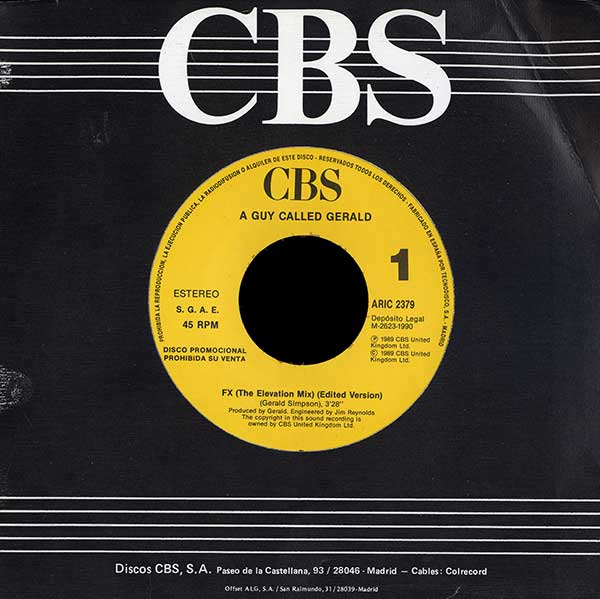 A Guy Called Gerald - FX (the elevation mix - edited version) [One-Sided Promo] ES 1989 7" Single; CBS: ARIC 2379 [one-sided promo in black sleeve] Credits: Written by Gerald Simpson. One-sided promotional Spanish release with Jukebox centre.