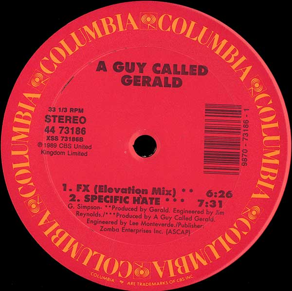 ![]() A Guy Called Gerald - FX (US Release) US 1989 12" Single; Columbia: XSS 73186 [33⅓rpm] Released: Credits: Written by G. Simpson. "FX (mayday mix)": Remix and Additional Production by Mayday (with Assistance from Carl Craig) for Best Beat Ltd. "FX (elevation mix)" engineered by Jim Reynolds. "Specific Hate" engineered by Lee Monteverde. ![]() A Guy Called Gerald - FX - US 12" Single - Front