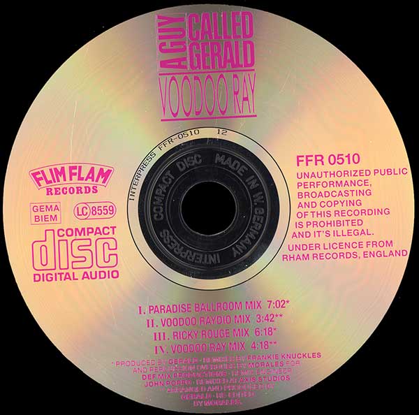 ![]() A Guy Called Gerald - Voodoo Ray (Frankie Knuckles Remixes - German Release) Credits: Produced by/Written-By - Gerald Simpson. "Voodoo Ray (Paradise Ballroom Mix)"/"Voodoo Ray (Voodoo Raydio Mix)"/"Voodoo Ray (Ricky Rouge Mix)" all remixed by Frankie Knuckles. Overdubs/Percussion: David Morales. Remix engineer: John Poppo. "Gerald's Rham On It Mix" as stated on front cover is not on release. Instead, the "Ricky Rouge Mix" is track 3 and not announced on front cover. Edit mixes on the CD single - timings taken from playing the CD - these differ from the (incorrect) timings on the sleeve. ![]() A Guy Called Gerald - Voodoo Ray (Frankie Knuckles Remixes - German) - German CD Single - Credits