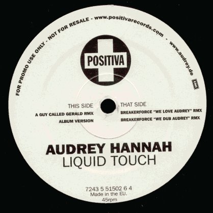 DE 2003 12" Single; Positiva: 7243 5 51502 6 4 [Promo] 5:25 Liquid Touch (A Guy Called Gerald RMX) Credits: Additional production by Gerald Simpson at 90+ Studio, London Comments: Remixed by A Guy Called Gerald. ![]() Audrey Hannah - Liquid Touch - German 12" Single - Back
