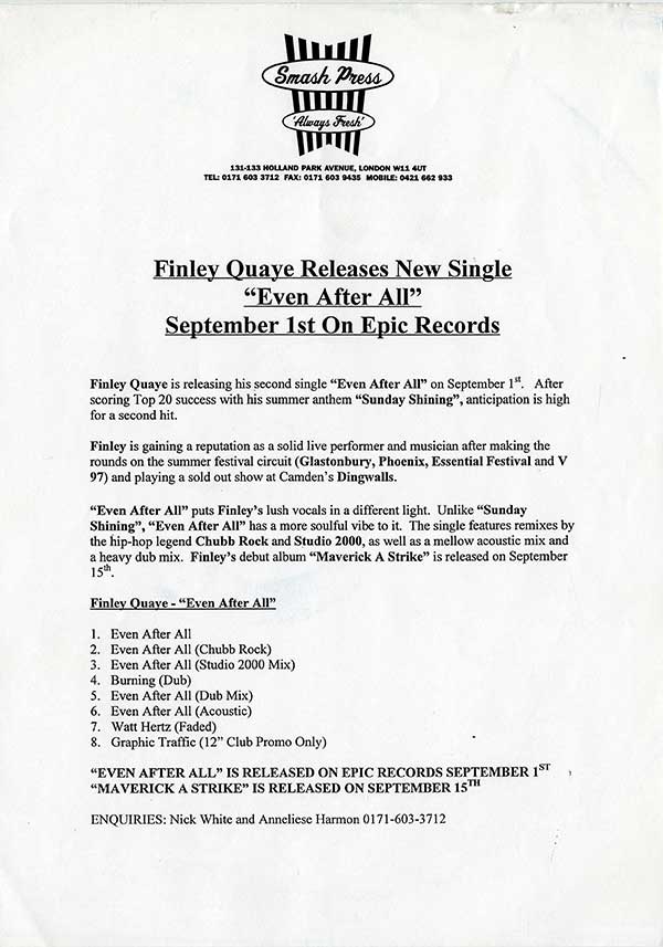 ![]() Finley Quaye - Even After All - UK Promo 2x12" Single - Press Release