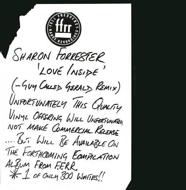 ![]() Sharon Forrester - Love Inside (Guy Called Gerald Remix) UK 1995 12" Single; FFRR: FDDJ-253 [Promo-only of 300 - same track both sides] Credits: Written by W Frazer and M Birch. Comments: Promo-only 12" single of only 300 of the Guy Called Gerald remix of Sharon Forrester's "Love Inside". The compilation album that they mention is "Jungle Massive Vol. 1" (see below) - only recently (2010) discovered, however the track isn't credited as the Gerald remix. The track did surface on Gerald's "Radio One Essential Mix" - some mixes of this surface occasionally on bootlegs. :-) |