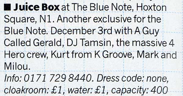 Juice Box at The Blue Note, Hoxton Square, N1. Another exclusive for the Blue Note. December 3rd with A Guy Called Gerald, DJ Tamsin, the massive 4 Hero crew, Kurt from K Groove, Mark and Milou. (Flyer from borosix.co.uk) |