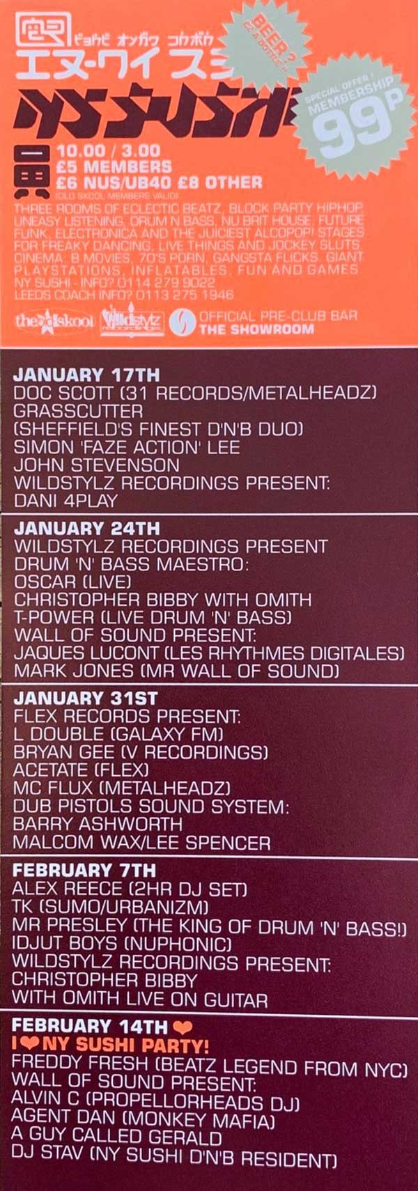 NY Sushi at The Music Factory, Sheffield. Read the NY Sushi headlines. "All the kids crashed and slaughtered and then pinned down with Jon Stapleton in a Dope On Plastic stylee! Patrick 'Forged' a beautiful partnership with Ross Allen! Alcho nurses and narco doctors operating on some poor unsuspecting chap live on stage ("It's performance art, darling!"). It all goes off up here, you know. January 31st has the entire Flex Recordings posse alongside The Dub Pistols and Barry Ashworth, February 7th The Idjut Boys, Alex Reece, Christopher Bibby from Wildstylz Recordings and TK from Waxploitation, February 14th Freddy Fresh, A Guy Called Gerald, DJ Stay and Alvin V from Wall Of Sound, February 21st DJ Peshay and more to be announced and February 28th Andrew Weatherall and the Athletico crew inlcuding Psychadeliasmith live and The Jeep Beat Collective. Storming. |