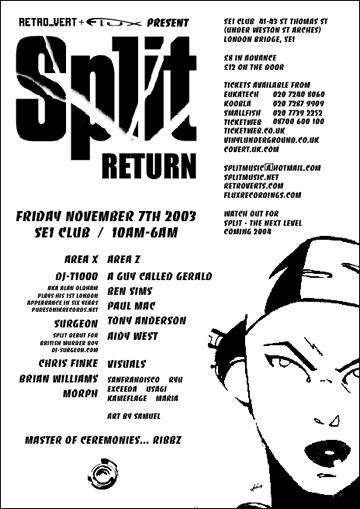 DetailsIn the background - on the right - probably exhausted! :-) Retro_Vert & Flux's Split Return, SE1 Club, 41-43 St Thomas Street, London Bridge, England FLUX and RETRO_VERT present "SPLIT - THE RETURN" AREA X ALAN OLDHAM aka DJ-T1000 - First London appearance in 6 years! AREA Z A GUY CALLED GERALD - Showcasing new material PLUS VISUAL CREWS. Exceeda/SanFrandisco/Ryu/KAM-FLAGE(DUBSTRAKT)/USAGI/Maria TICKETS £8 IN ADVANCE FROM: EUKATECH, SMALLFISH, KOOBLA, COVERT, VINYL UNDERGROUND and www.ticketweb.co.uk https://www.myspace.com/splitmusic |