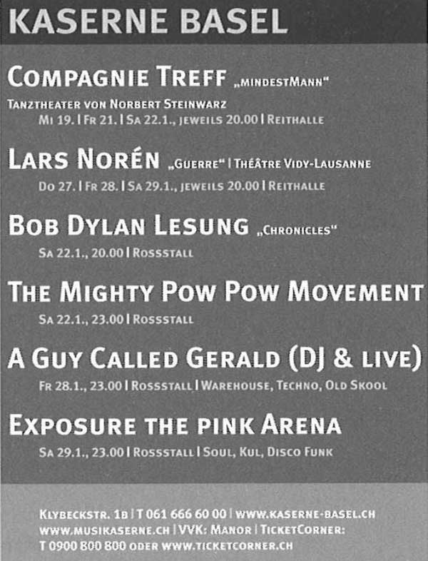 | 28 January: A Illegal Warehouse Rave: "The History of Tekkno 90-94", Kaserne Basel, Basel, Switzerland |