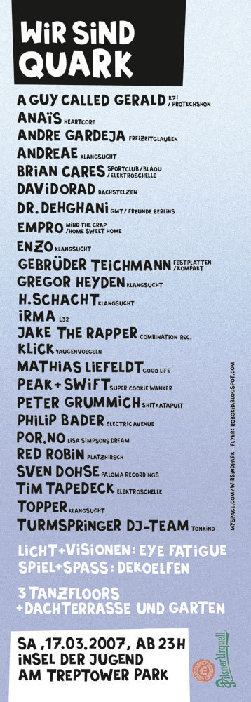 DetailsA Guy Called Gerald, live, Insel Treptow, Samstag, 17.03.2007 | 23:00 Uhr Lineup: a guy called gerald [k7!/protechshon] Denn Quark, macht stark! |