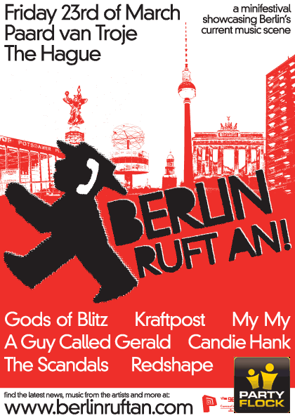 Details23 March: Berlin Ruft An!, Paard Van Troje, Prinsegracht 12, Den Haag, Netherlands BERLIN RUFT AN!: Nieuw festivalconcept in Paard van Troje! Vrijdag 23 maart BERLIN RUFT AN ft. A Guy Called Gerald (live, Proto Acid-The Berlin Sessions), Candie Hank aka Patric Catani, Kraftpost, My My, The Gods Of Blitz, The Scandals, Red Shape Festival met bands en dance-acts uit Berlijn / aanvang: 20:30 / grote + kleine zaal /E 13,50 Berlijn is al jaren spraakmakend op muzikaal en creatief vlak. Om Nederland kennis te laten maken met de onbegrensde creativiteit in de Berlijnse muziekscene lanceren Paard van Troje en het TodaysArt Festival het nieuwe festival Berlin Ruft An op de vrijdagavond (en nacht) van 23 maart. Op de twee podia van het Paard van Troje treden dan meer dan acht bands, Dj's en live-acts op. Gezamenlijke vormen deze een programma dat een actueel beeld geeft van de stand van zaken binnen de hedendaagse invloedrijke muziekscene van Berlijn, waarbij de focus ligt op de diversiteit van al de onbekende muzikale "earcandy" dat de Duitse hoofdstad te bieden heeft. Onder andere optredens van Gods of Blitz, The Scandals en oudgediende A Guy Called Gerald maken dat deze eerste editie van Berlin Ruft An de sfeer van Berlijn naar Nederland weet te halen. berlin ruft an! Introducing to you the first edition of "Berlin Ruft An". A new Festival, Friday the 23rd of March in The Hague's "Paard van Troje". Eight bands, dj's and live-acts are staged in the Paard van Troje showcasing Berlin's vivid, adventurous and diverse music scene. Amongst the performing acts are: - Gods of Blitz |