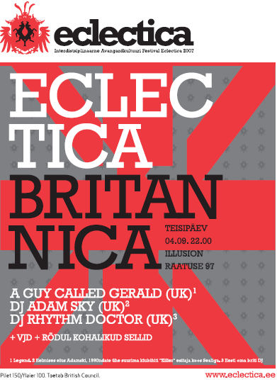 Details4 Sep: Eclectica Britannica Festival, Britannica, Illusion, Raatuse 97,Estonia ECLECTICA FESTIVAL - BRITANNICA A GUY CALLED GERALD UK pilet 150/flaier 100 |