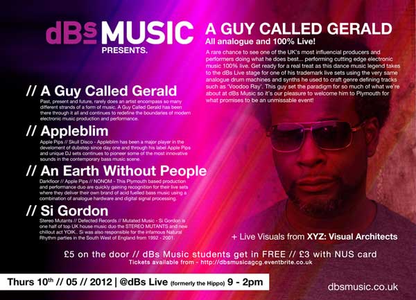 DetailsdBs Music Presents. A Guy Called Gerald (Live) This is a rare chance to see one of the UK’s most influencial producers and performers doing what he does best... performing cutting edge electronic music 100% live. Get ready for a real treat as this dance music legend takes to the dBs Live stage for one of his trademark live sets using the very same analogue drum machines and synths he used to craft genre defining tracks such as ‘Voodoo Ray’. This guy set the paradigm for so much of what we’re about at dBs Music so it’s our pleasure to welcome him to Plymouth for what promises to be an unmissable event! LINE UP: |