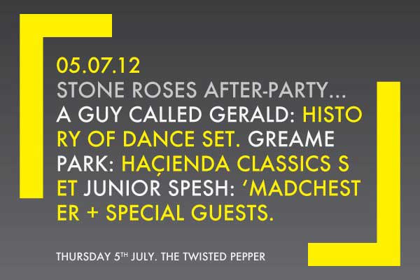DetailsFac54 - Stone Roses Afterparty with A Guy Called Gerald & Graeme Park at The Twisted Pepper Line-up / FAC54 Stage: A GUY CALLED GERALD Basement: GRAEME PARK & more to be announced... Thursday July 5th 2012 |
