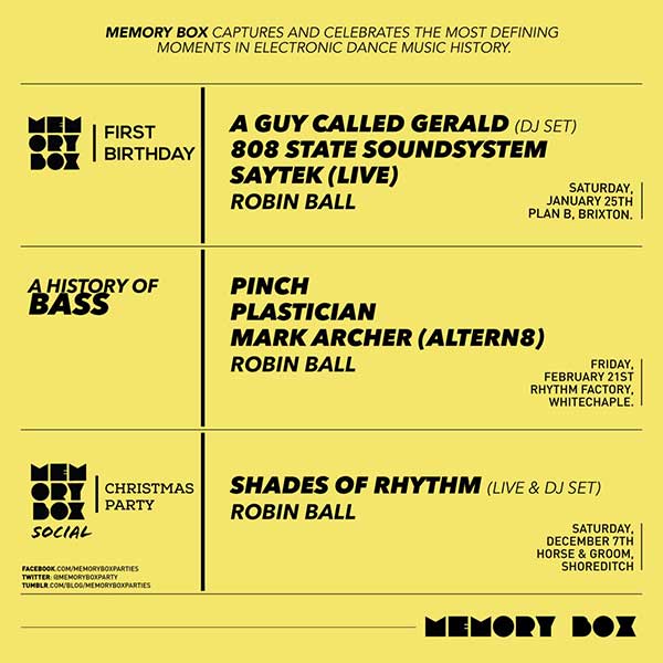 Tue, 31 Dec 2013 £22.00 Ticket + booking fee / Early bird - £8.00 + £1.00 (closes Thu, 25 Dec 11:59pm) Line-up / A Guy Called Gerald (dj set), 808 State Soundsystem, Saytek (live), Robin Ball Promoter / Groove Pleasure, Socialeyes, Memory Box Parties MEMORY BOX 1ST BIRTHDAY A GUY CALLED GERALD (DJ SET) // 808 STATE SOUNDSYSTEM SATURDAY 25TH JANUARY @ PLAN B, BRIXTON TICKETS FROM https://www.residentadvisor.net/event.aspx?542440 On Saturday 25th January 2014, Memory Box turns 1 year young with celebrations coming from legendary club culture heroes A Guy Called Gerald and 808 State! In its inaugural year, Memory Box has captured and celebrated defining moments in the last few decades of electronic music. Delving deep into its rich history, Memory Box trawls the archives to produce a broad selection of sonic memoirs. Heading to Plan B in Brixton for the first birthday, Memory Box celebrates one of the most acknowledged sub-genres of our generation, Acid House. With one of the most iconic names in dance music, A Guy Called Gerald on the bill with old band mates and revolutionaries from the late 80’s 808 State Soundsystem, both digging through their crates to play specially crafted sets showcasing the defining movement known as Acid House. One of the most exciting UK electronic artists of recent time, Saytek will bridge the gap between old and new with a special Memory Box live show of oldskool Detroit, Chicago and acid inspired material. While Memory Box creator Robin Ball lights the birthday candles with a warm up of acid-tinged electronica. As A Guy Called Gerald muses: "This will be my journey of music starting with the drum. There will be one minute of silence before the show so I can contact my ancestors. I'll be taking you from the jungles of Africa, to the music of slavery, to the music of Jamaica, to the automated cold grey music of the industrial era. I'm going to take you from the soul to the coal." Previous explorations through the Memory Box have heard Tom Middleton giving a history class on the Roland 808, Altern-8’s Mark Archer playing his warehouse rave classics, Rennie Pilgrem playing an old skool breaks set, Justin Robertson on a classic acid house tip, and Jerome Hill spinning old skool techno. Upcoming parties include Shades of Rhythm hosting the Memory Box Christmas Party and February’s party dives deep into a History of Bass with Pinch, Plastician and Altern-8. Memory Box creator Robin Ball says “A Guy Called Gerald is the perfect guest for our 1st birthday. He encapsulates everything Memory Box parties are about. Steeped in electronic music history and yet still breaking down musical boundaries, 'Voodoo Ray' has become the Memory Box anthem. Whether its a night of straight up retro fun at a Memory Box Social or a serious musical Memory Box moment, that track always grips the dance floor then makes it explode! And on a personal tip Gerald's 'Emotion Electric' is one of my all time favourites! It melts my soul.” As an early birthday gift, 808 State gave us their top 10 acid house tracks to wet our whistles (no rave pun intended). 808 State - Top 10 A GUY CALLED GERALD An iconic name in dance music, A Guy Called Gerald stands out for consistent innovation, excellence and refusal to compromise. A Guy Called Gerald kick started Europe’s acid house frenzy with his ’88 classic ‘Voodoo Ray’ and 'Pacific State' (as part of 808 State) and went on to lay down the blueprint for jungle / drum n bass. Nine albums and 25 years of independence later, he continues to push the boundaries of electronic dance music touring worldwide bringing his "true school" flavour to a world overloaded with pop pap. Although his remixes are relatively enviable including the likes of David Bowie, Cabaret Voltaire, Black Uhuru, Finley Quaye, Lamb, Tricky and The Stone Roses, it is Gerald’s own productions and refusal to plough anyone’s furrow but his own which has marked him out. A Guy Called Gerald is responsible for the birth of British dance music as you know it today and continues to explore what is possible in the studio. UK club culture has many people to thank for transforming the imported sound of America into the biggest youth movement my generation has experienced, but nobody else has redefined it so much with the character and soul of Britishness, creating music for both the feet and the head, and indelibly altering our cultural landscape." Joe Roberts, DJ Magazine https://www.guycalledgerald.com/ 808 STATE SOUNDSYSTEM (808 State *DJ* Set) The story of 808 State defines an era of electronic dance music and sets a blueprint of possibilities for future generations. As the NME observed “808 State revolutionised a whole genre of music in the late-80s, inspiring Underworld, Orbital and the Chemical Brothers in the process." Formed in Manchester in 1988 by Graham Massey, Martin Price and Gerald Simpson, 808 State's first album – Newbuild - is now regarded as a milestone in UK electronica. Quadrastate followed, including Pacific State, becoming an end-of-night anthem at the Haçienda and breaking out of the dance underground when it was picked up by daytime BBC Radio 1. The band pushed against dance-celebrity culture with intentionally minimalist record sleeves and a reluctance to self-promote. During this time Gerald recorded his own hit Voodoo Ray and decided to pursue his own career as A Guy Called Gerald. He was replaced by the 808 State DJs, Andrew Barker and Darren Partington. In 1989 Paul Morley signed the band to the ZTT label, and the first fruit of this partnership, the albumNinety, was awarded 10 out of 10 by the NME. The Guardian declared that with this record, "808 State mapped out the future of club music, utilising techno, ambient and rock..." In 1991 they released their biggest selling album ex:el, drafting in guests such as Björk and Bernard Sumner from New Order, as well as producing MC Tunes' album The North At Its Heights. At the peak of chart success 