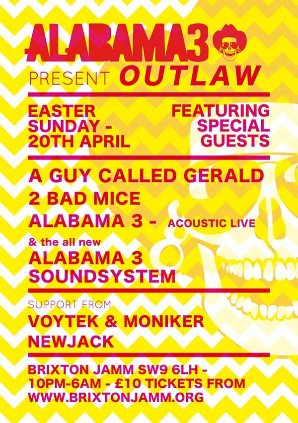 DetailsAlabama 3 presents Outlaw with A Guy Called Gerald + 2 Bad Mice at Brixton Jamm Date / Line-up / Alabama 3 Sound System (+ unplugged live show), A Guy Called Gerald, 2 Bad Mice Outlaw is back at Brixton Jamm this Easter Sunday, April 20th! The night's antics will begin with an Alabama 3 unplugged show, where we shed our narco-acoustic slant on all your favourites, with support coming from lots of fellow outlaws! Then, we'll carry things on into the early hours by premiering the all new Alabama 3 sound system show, where the line up delves into the roots and history of Rave and Acid House culture, a place that played a key part in the life of Alabama 3. A Guy Called Gerald, an artist who created seminal track 'Voodoo Ray' and 2 Bad Mice who were key figures on the Rave scene releasing such legendary tracks like 'Bomb Scare' will play alongside Alabama 3 Sound System. With all three set's guaranteed to destroy the dance floor, they will also highlight the part of all three in both the history of this scene as well as their continued relevance today. This is underground dance music delivered with a cutting edge mindset and a mountain of experience, not something you want to miss. Line up: Alabama 3 - Acoustic Live Plus Special Guests A Guy Called Gerald Support from: |