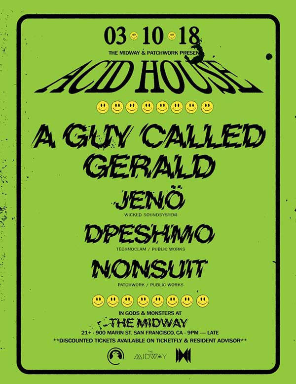 DetailsAcid House with A Guy Called Gerald Date / Saturday 10 Mar 2018 Line-up / A Guy Called Gerald, Jenö, dpeshMo, Nonsuit Patchwork SF & The Midway SF present A Guy Called Gerald with support from The Public Works SF Residents //\\//\\//\\//\\//\\//\\//\\//\\//\\ An iconic name in dance music, A Guy Called Gerald stands out for consistent innovation, excellence and refusal to compromise. A Guy Called Gerald kick started Europe’s acid house frenzy with his ’88 classic ‘Voodoo Ray’ and 'Pacific State' (as part of 808 State) and went on to lay down the blueprint for jungle / drum n bass. //\\//\\//\\//\\//\\//\\//\\//\\//\\ Gods & Monsters Room | 21+ | Cash Only - ATMs Onsite |