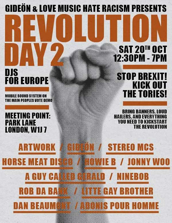DetailsRevolution Day 2 - Stop Brexit Date / Sat, 20 Oct 2018 - Sun, 21 Oct 2018 Line-up / Gideön, Artwork, Horse Meat Disco, A Guy Called Gerald, Ninebob, Howie B, Dan Beaumont, Adonis Pour Homme, Little Gay Brother, Jonny Woo Join us on a mobile soundsysyem at the People's Vote march to party and protest and STOP BREXIT. |