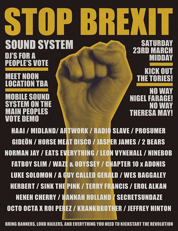 DetailsStop Brexit - Stop Brexit - DJs For A People's Vote Date / Saturday 23 Mar 2019 Line-up / Haai / Midland / Artwork / Gideön / Horse Meat Disco / Norman Jay / Prosumer / Eats Everything / 2 Bears / Waze & Oddysey / Chapter 10 x Adonis / A Guy Called Gerald / Ninebob / Wes Baggaley / Sink The Pink / Luke Solomon / Savage / Hannah Holland / Secretsundaze / Terry Francis / Krankbrother / Herbert / Jasper James + many many more! A mobile sound system at the People’s Vote Demonstration. We are hitting the streets en-masse with a massive sound system and a huge DJ lineup to make our voices heard at this critical moment in time. STOP BREXIT NOW!!!!! International DJs from across the globe join forces to play music, unite against Brexit and call for another vote now we have all the facts. We will be part of the massive People's Vote demo. Last time we had 700,000 people. Let's make it a million this time.....Bring all of your friends. Take to the streets. STOP THIS INSANITY. |