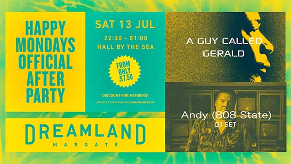 Details13th July 2019 22:30 - 01:00 (last entry 23:30) Hall By The Sea Dreamland is hosting an official Happy Mondays After Show Party on Saturday 13th July, with A Guy Called Gerald and 808 State’s Andy Barker taking over the Hall By The Sea for one night only. Tickets are £7.50 + booking fee in advance. Limited members tickets available at £5 + booking fee in advance. You must buy a separate ticket to attend to the after party (not included in Happy Mondays tickets), last entry is 11.30pm. This is an 18+ event. The legendary Happy Mondays will headline the Scenic Stage, with support from 808 State, on 13th July from 7.30pm to 11pm. Anyone wishing to attend the aftershow party – regardless of whether or not they bagged Happy Mondays tickets - can purchase a separate ticket in advance, and head over to Hall By The Sea from 10.30pm (last entry 11.30pm). Once 808 State have finished warming up the crowds for Happy Mondays, DJ Andy Barker will get the party started, before former band mate and now iconic DJ and producer A Guy Called Gerald joins him for a night to remember. If you have any specific access needs, please contact us prior to the event on office@dreamland.co.uk. |