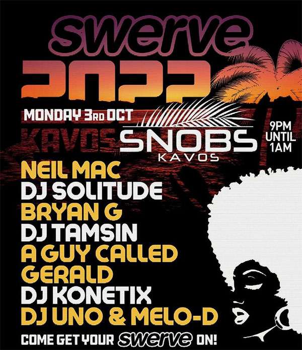 DetailsMonday 3rd October 2022 Swerve 2022, Snobs, Kavos, Corfu Lineup: Neil Mac |